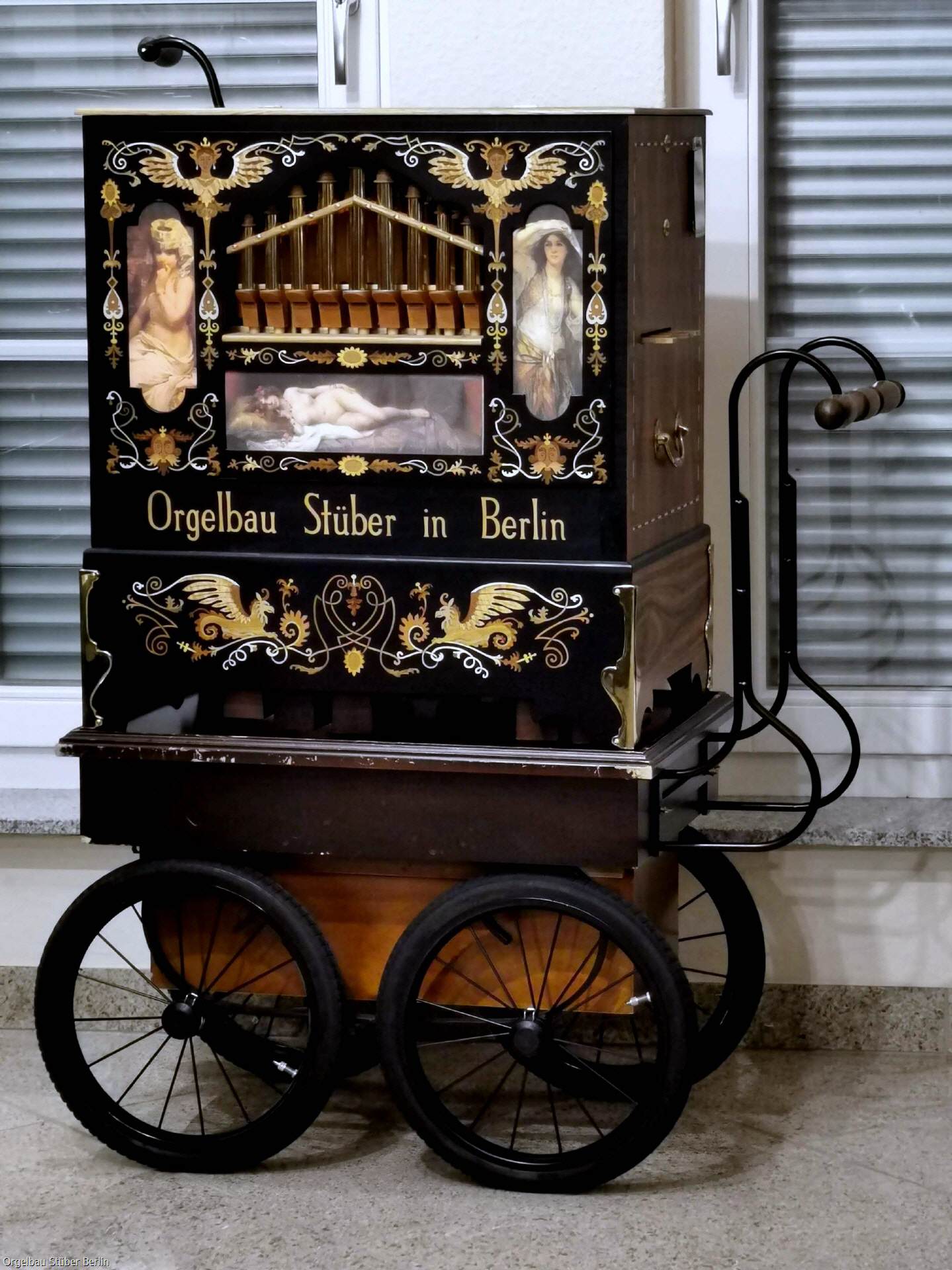 unkomplizierte Straßen-Drehorgel mit ausgewogenem Klang / 31 Pfeifen / 16 Bordunpfeifen / 15 (Pan-) Zauberflöten / Balg mit Doppelschöpfer / aufwendige deutsche Intarsien / massive Messingbeschläge / spielbar mit 31er Musikrollen allen gängigen Hersteller.