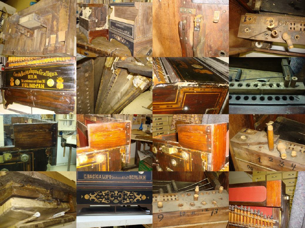 Realizamos restauros cuidadosos para os mais diversos realejos e órgãos, utilizando os conhecimentos mais recentes. A nossa prioridade é manter, na medida do possível, a essência do original. Sempre que necessário, as peças são reconstruídas com materiais e tecnologias originais. Se não tivessem sido restaurados, esses realejos não teriam sobrevivido à rigorosa acção da Polícia de Berlim: (link para videoDHM)