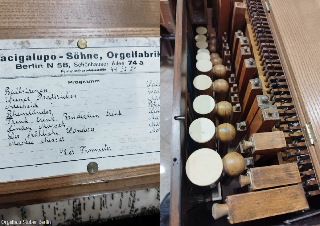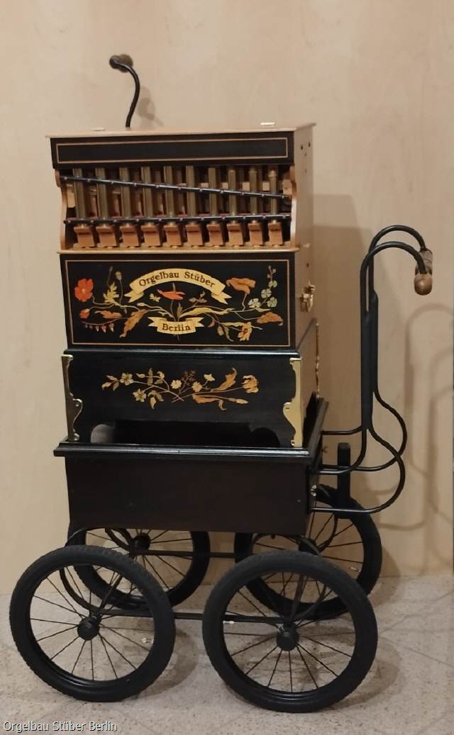 unkomplizierte Straßen-Drehorgel mit variantenreichem Klang / 33 Pfeifen = 10 Pfeifen schaltbarer Violinen + 10 (Pan-) Zauberflöten + 13 Gedacktpfeifen, darunter 3 oktavierende Bassverdoppelungen /